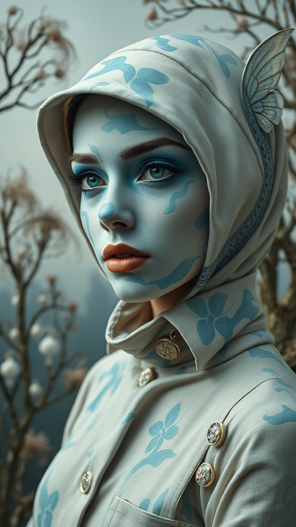 A mysterious spy with subtle blue camouflage painted delicately like porcelain across her face, embodying elegant figures and timeless fashion, features intricate designs of mythical creatures with flowing forms in soft pastel tones. The scene captures an Oliver Jeffers-inspired aesthetic, set against a surreal backdrop, blending elegance with enigma.