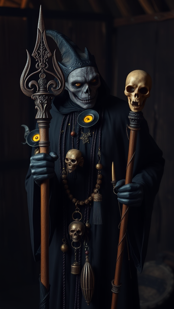 A mysterious voodoo priest stands in a shadowy hut, his dark complexion accentuated by piercing yellow eyes set in symmetrical, unsettling features. His face is finely proportioned, matching his equally well-balanced body and limbs. His fingers taper with eerie precision, adorned in a richly detailed voodoo dress that clings to his form. A skull-topped staff is clutched in his grip, laden with arcane voodoo trinkets and charms, each intricately designed and detailed. The scene is captured with ultra-realistic clarity, presenting a waist-length portrait of him through careful cinematic photography. The dimly lit environment is enhanced with movie-quality rendering, where octane and RTX ray tracing lighting create real shadows and a focused depth of field. VFX post-production highlights every intricacy in 8k resolution, capturing a haunting essence full of supernatural allure.
