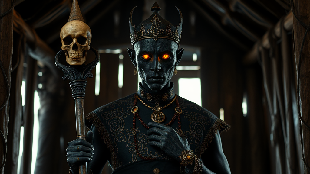 A mysterious voodoo priest stands in a shadowy hut, his dark complexion set against glowing yellow eyes. His symmetrical, intriguingly creepy features are captured in a proportioned face, body, limbs, and fingers. He wears an exquisitely detailed voodoo dress, accessorized with arcane talismans and a staff topped with a skull. The intricate patterns and details of his attire are rendered with ultra-realistic precision. This waist-length portrait employs cinematic photography lighting, highlighted with photorealistic, movie-quality rendering using octane and RTX ray tracing. With a sharp focus and depth of field, the scene's real shadows and VFX post-production create an immersive 8k image that stays true to the atmospheric essence of a voodoo priest.