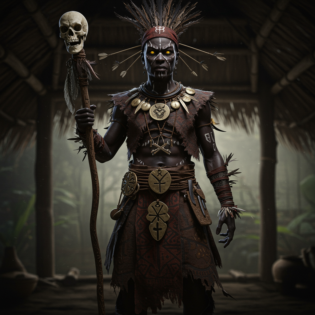 A mysterious voodoo priest stands in a shadowy hut, his dark complexion contrasting with piercing yellow eyes. His symmetrical and enigmatic features are highlighted by the soft play of shadow and light. He possesses an air of mystique, with a perfectly proportioned face, body, limbs, and fingers, making him an imposing figure. Draped in an exquisitely detailed voodoo dress adorned with intricate patterns and symbols, he holds a staff topped with a hauntingly carved skull. The priest is bedecked with unique voodoo accessories that jingle softly with his every movement, each piece etched with meticulous designs. The ultra-realistic depiction captures the essence of his character in a waist-length portrait, using cinematic quality lighting and rendering techniques. The photo's depth of field draws focus to the priest, casting real shadows across his face as if he is stepping out of the realm between reality and fantasy. The scene is brought to life with the highest detail quality, using advanced VFX and RTX ray tracing, offering an 8k resolution view that immerses you in the eerie ambiance.