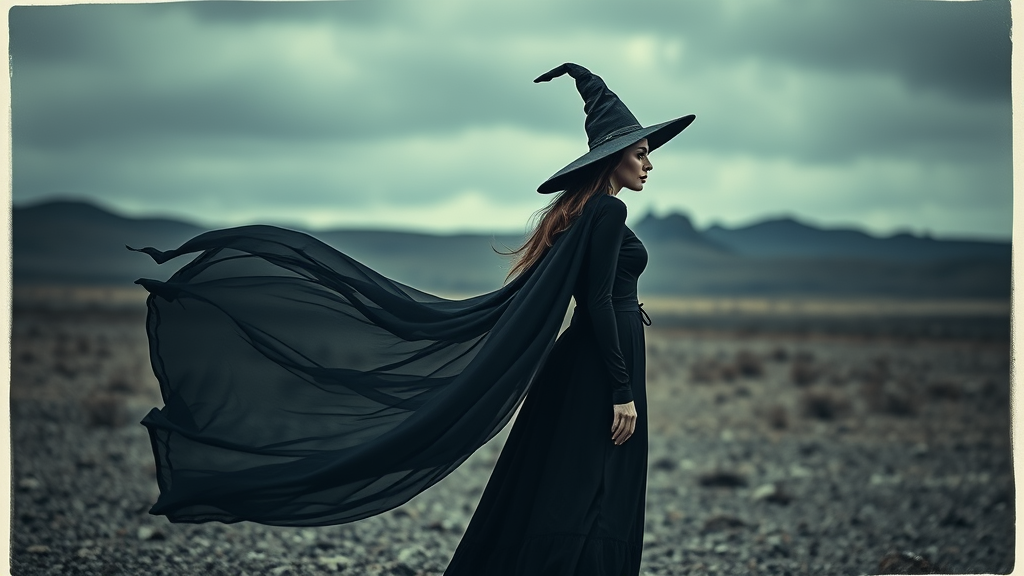 A mysterious woman in a stylish witch hat stands in a desolate landscape, her flowing black gown billowing in the wind. She gazes intently into the distance, embodying the essence of black metal mystique. Captured through the lens of a 105mm camera, the scene unfolds like a Polaroid photo, set against a moody backdrop. The tall, dark figure is framed in a portrait ratio, 9:16, adding to the dramatic and otherworldly atmosphere.