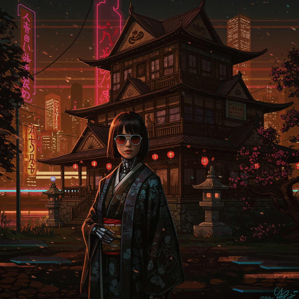 A mysterious woman in sleek sunglasses stands confidently next to an ornate, old-fashioned manor, set against a backdrop of neon-lit cyberpunk-cityscape. Her attire merges modern cybernetics with traditional Japanese kimono elements, creating a harmonious blend of tech and culture. The scene is rendered in a style reminiscent of Ross Tran, with bold graphic lines and a rich palette of dark black and deep amber tones. Intricate Japanese iconography adorns the manor, hinting at a fusion of past and future. Multi-layered color fields create depth and vibrancy, while subtle additions of futuristic elements like holographic cherry blossoms add a touch of whimsy to the otherwise bold and stylized composition.