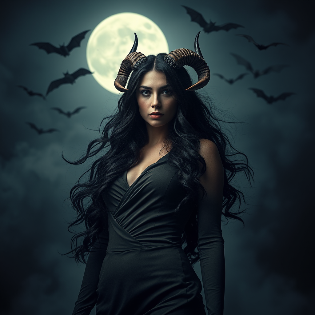 A mysterious woman with flowing, obsidian hair adorned with elegant horns stands confidently in a dark, misty setting. Her cascading waves gently frame her enigmatic face. She wears a form-fitting, earth-toned gown that resonates with the hues of her dark locks and horned crown. Enveloped in an atmosphere shrouded with smoke, bats flutter and swoop around her, enhancing the mystical ambiance. Dim lighting from a luminous full moon envelops her figure, casting an ethereal aura, while the shot, captured from a low vantage point, heightens her commanding silhouette. This fantasy-inspired scene bursts with intense lighting contrasts and vivid imagery, likely captured through a digital SLR or mirrorless camera equipped with a wide-angle lens to encapsulate the expansive, atmospheric background.