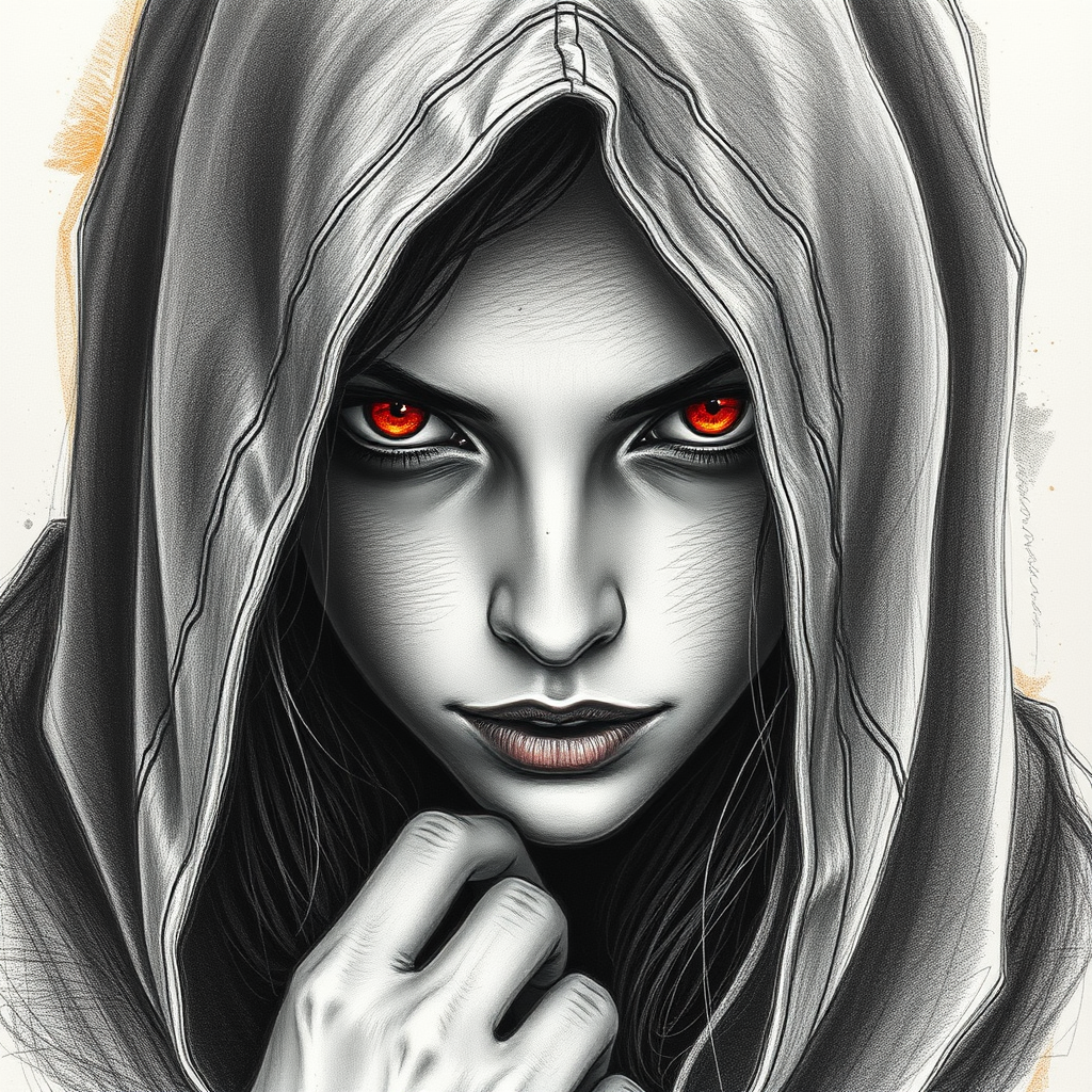 A mysterious woman with intense red eyes, cloaked in a dark silver hood with subtle hints of orange, captured in a deeply detailed penciling style. Inspired by the intricate artistry of Raphael Lacoste, this emotionally charged portrait echoes the dynamic flair of Marc Silvestri. The piece carries the textured nuances reminiscent of Ingrid Baars, skillfully blending sketches and bold emotions. Her gaze pierces through the drawing, evoking a sense of haunting allure.