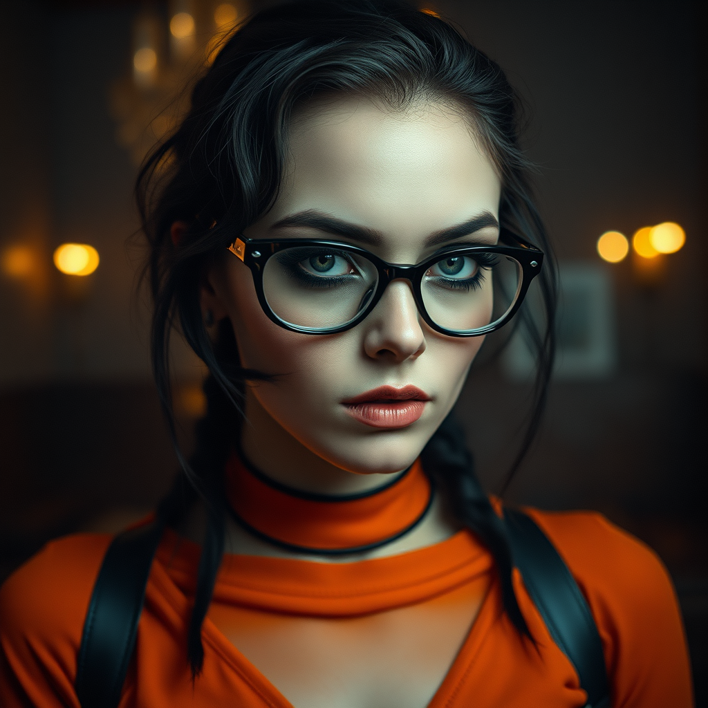 A mysterious woman with the essence of a goth Velma from Scooby-Doo, she has striking dark eye makeup and a penchant for the dramatic. Her eye glasses frame her thoughtful gaze, and she dons an orange top that contrasts with her edgy, gothic attire. The ambiance exudes a refined kitsch and golden age aesthetic, resonating with the surreal touch of Jessica Drossin and the narrative flair of Kieron Gillen. Her presence is enshrined in a life-sized portrayal, where the whimsical charm of catcore subtly weaves its way into the scene, evoking the artistic prowess of Dima Dmitriev.