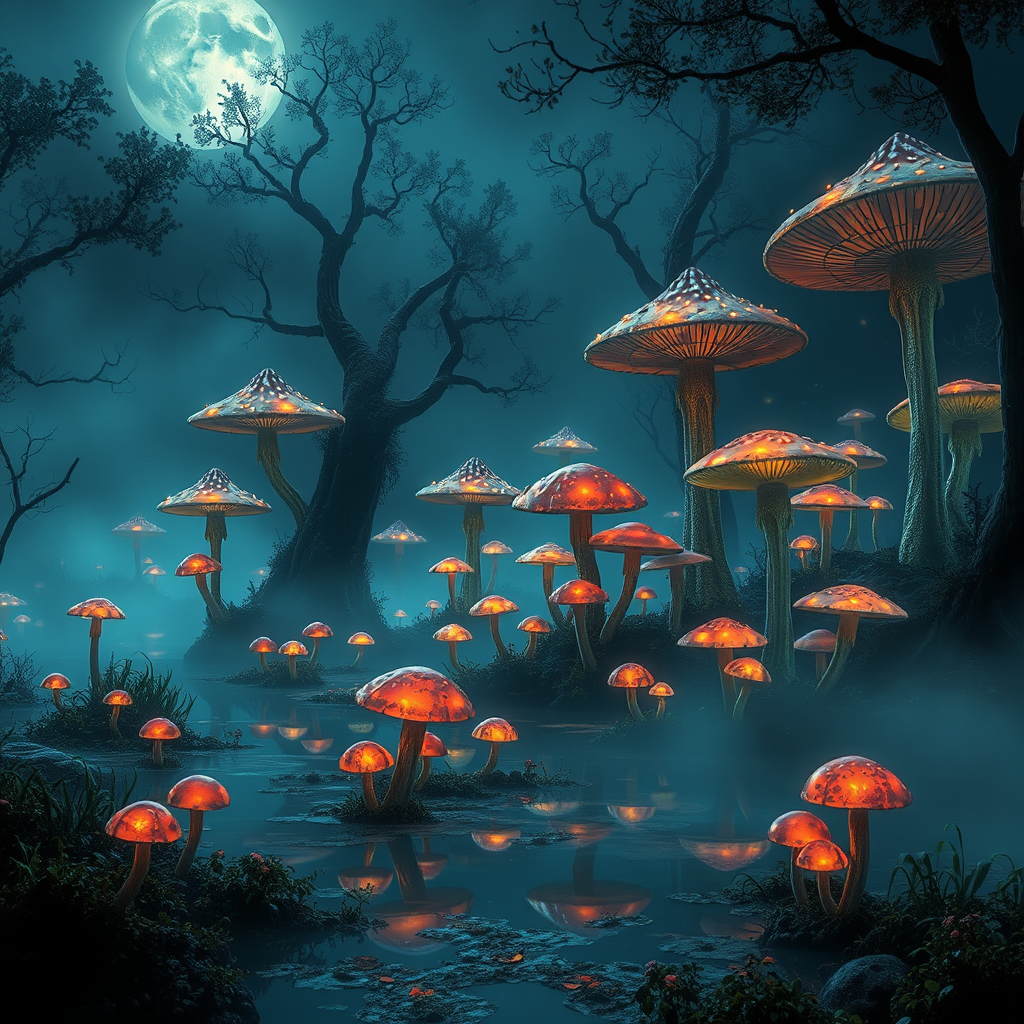 A mystic swamp enveloped in a dense mist, adorned with an array of vibrant and towering mushrooms that glow in the moonlit night; the scene is illuminated by ethereal, fantasy hues that dance across the water's surface, creating a mesmerizing play of light and shadow; rendered in exquisite detail, capturing the enchanting atmosphere with crystal clarity, reminiscent of an octane render; an artwork of such striking beauty that it becomes a sensation on platforms like ArtStation and a featured masterpiece on DeviantArt.