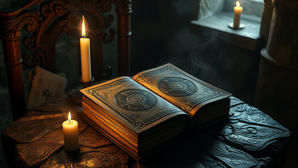 A mystic tome of ancient spells rests enigmatically on a worn stone table deep within the shadowy catacombs, its pages illuminated by flickering candlelight. The book's cover is adorned with intricate engravings and arcane symbols, showing the mastery of craftsmanship reminiscent of Greg Rutkowski, Peter Mohrbacher, and Magali Villeneuve. The scene is a hypermaximalist masterpiece, captured in stunning octane render with Unreal Engine's precision, showcasing an 8k resolution that brings to life the fantastical elements. Mysterious wisps of magic and dust dance through the air, as if whispering secrets long forgotten, while intricate patterns and textures tell tales of arcane knowledge. The atmosphere is charged with enchanting allure, a blend of surrealism and fantasy, inviting the viewer into a world where the lines between reality and magic blur.