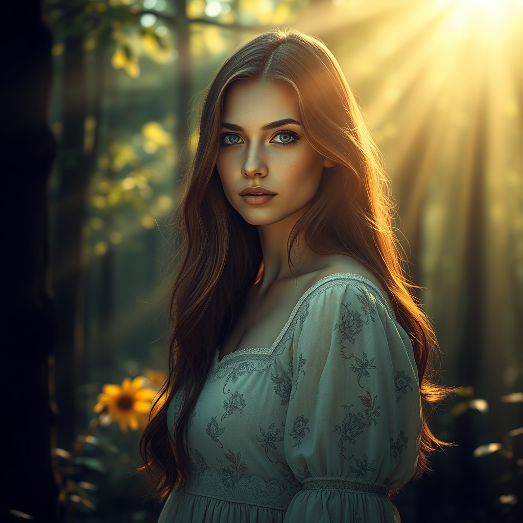 A mystical and enchanting forest with ethereal sunbeams gently filtering through the lush foliage. A young woman with a realistic, perfectly proportional face and long flowing hair stands gracefully amidst the serene woodland. She wears a vintage dress that adds a touch of timeless elegance. The scene is illuminated by a mystic, incandescent light that casts an aura-like glow around her, enhancing the cinematic composition. The overall atmosphere is dramatic and whimsical, with a sense of melancholy that is both heavenly and divine. The setting, reminiscent of Elly May’s style, captures extremely high details in ultra HD, displaying an 8k HDR quality with intricate textures and vibrant colors. Her presence feels celestial, her expression conveying a subtle, poignant depth, while the surrounding environment showcases breathtaking beauty and tranquility.