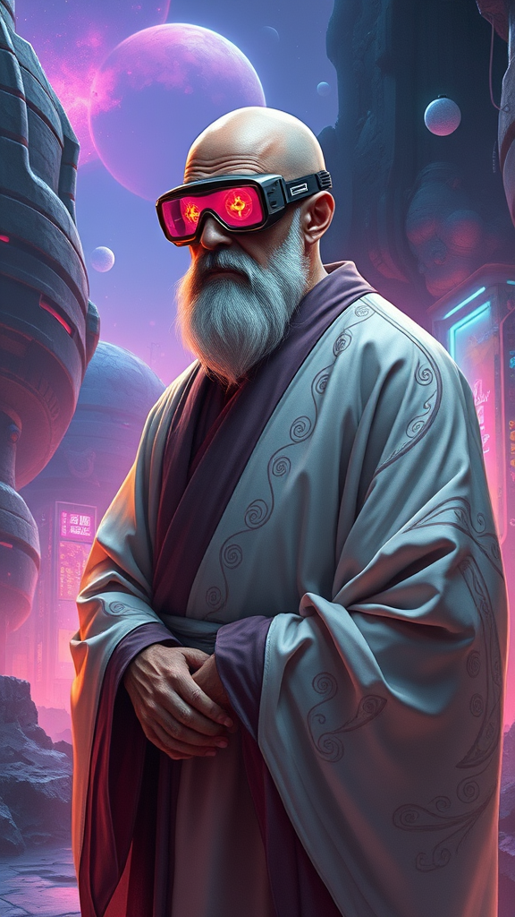 A mystical and ethereal hyper-realistic painting of a zen roshi bounty hunter clad in flowing futuristic zen robes, with intricate patterns reflecting his enigmatic nature. He wears advanced, sleek AR goggles that merge ancient wisdom with cutting-edge technology, set against a backdrop of a neon-lit, otherworldly landscape. His calm demeanor contrasts with the chaos around him, embodying tranquility in the midst of futuristic turmoil. His presence feels both timeless and advanced, a guardian of balance within a discordant universe.