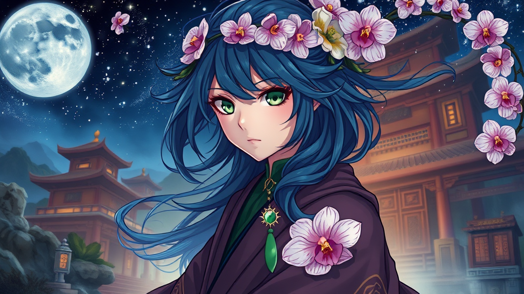A mystical anime sorcerer from the Tang dynasty, adorned with an orchid hair accessory and a jade charm, stands in an ancient temple under the midnight sky. Their eyes, a striking emerald green, contrast with their flowing midnight blue hair, which is decorated with a celestial star ornament. The background reveals a mystical landscape filled with ancient secrets, illuminated by a light that shines like a thousand stars. The sorcerer's expressive gaze meets the viewer, captured in a wide-angle portrait. Their robes cascade around them, blending with the mixed media rendering, as orchid blossoms swirl through the air like sparks of magic. The scene is infused with mystical lighting, casting an ethereal glow reminiscent of a Kay Nielsen illustration.