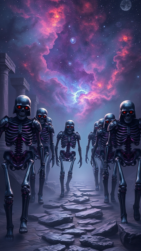 A mystical assembly of skeleton warriors rises from the shadows, clad in armor made from the nebulae of deep space, shimmering dark purples and reds. Their hollow eyes glow with ethereal light as they roam a landscape that fuses ancient ruins with celestial wonders. The scene is painted in hyper-realistic detail, capturing the intricate textures of bone and metal under a starlit sky. Amidst swirling cosmic clouds and astral reflections, each skeletal figure embodies a brooding elegance, influenced by the artistry of Magali Villeneuve and the dark, meticulous designs reminiscent of Zacharias Martin Aagaard’s work. Celestialpunk elements intertwine with fantasy, creating a wallpaper art that is haunting yet enchanting, telling stories of a world where the past and the cosmos collide.