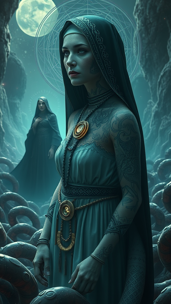 A mystical aunt adorned with shamanic tattoos stands in a surreal futuristic landscape, where sacred geometry intertwines with elements of chaos. Her figure, an intersection of a nun's solemnity and ethereal otherworldliness, seems to emerge from slithering slime that glows under 16k UHD HDR rendering. In this dreamlike scene, where boundaries are fluid and conventional realities blend, the feeling is both mesmerizing and disorienting, enhancing the allure of an UnrealisticDream.