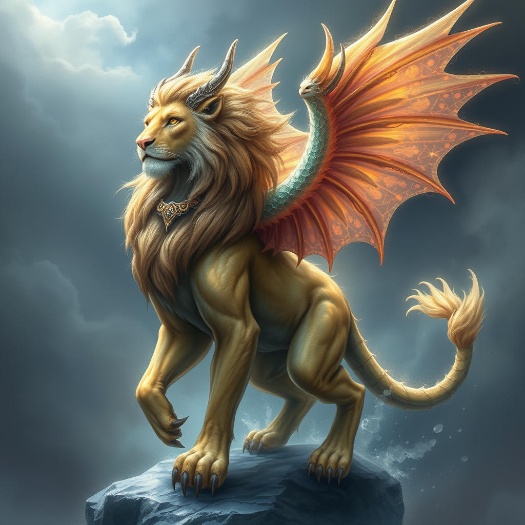 A mystical being with the grace and wisdom of an ancient sage, the strength and agility of a magnificent lion, and the shimmering wings of a celestial dragon, possessing eyes that see beyond the mortal realm and a melodious voice that can calm storms or rouse nations.