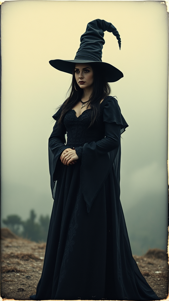 A mystical black metal-inspired woman stands in a flowing black gown with intricate patterns, a large, elegant witch hat perched atop her head. Her piercing gaze is fixed on the horizon as if seeking answers from the unseen. The scene is captured in a vintage Polaroid style with a 105mm lens effect, enhancing the dramatic contrast and atmospheric mood of the setting, enveloping her figure in shadows against an elongated 9:16 aspect ratio. The background hints at a misty landscape, adding an ethereal quality to her commanding yet enchanting presence.