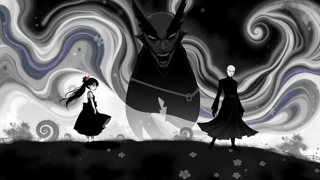 A mystical blend of black and white swirls with subtle purple highlights accentuates the enchanting characters from "Spirited Away," bringing to life Chihiro's resolute stance, the ethereal presence of Haku mid-transformation, and No-Face's enigmatic silhouette amid a dreamlike, shadowy landscape.