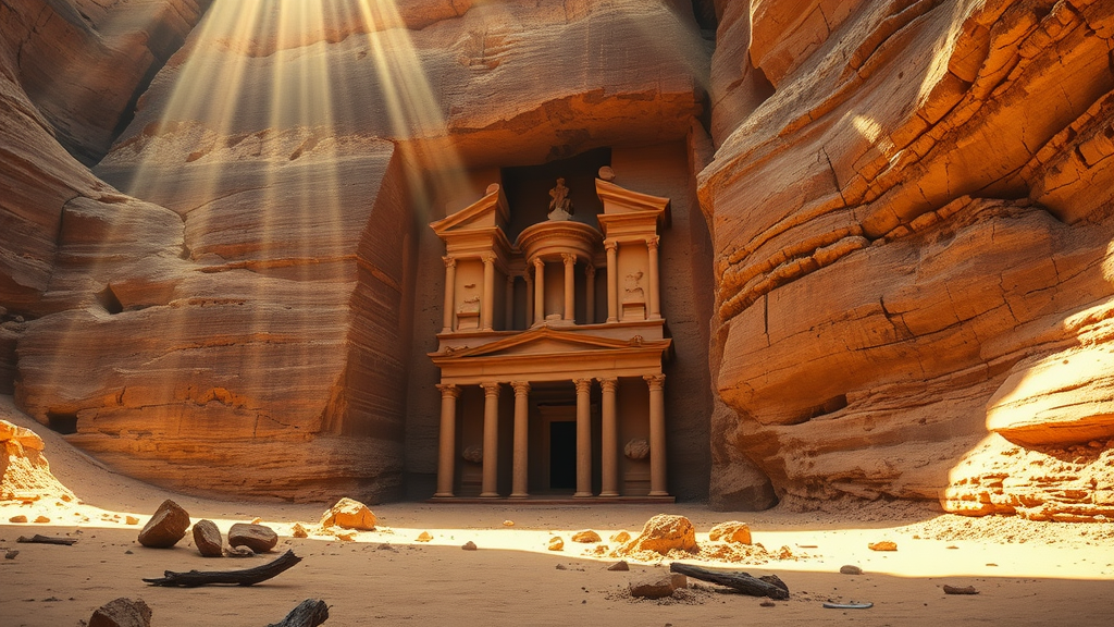 A mystical, bygone Sumerian Temple intricately carved into the side of a canyon wall, with remnants of ancient debris scattered near its grand entrance. Set in an expansive desert, the temple is bathed in dramatic, cinematic light, where rays encompass the dark canyon, illuminating it like a scene from ancient Petra. This visual spectacle is rendered in stunning UHD, HDR quality, maintaining a captivating volumetric lighting effect. The image exudes a sense of timeless mystery and profound history, devoid of modern imperfections or distortions such as deformed features or unnecessary artifacts, focusing solely on the awe-inspiring beauty and enigmatic allure of this hidden wonder.