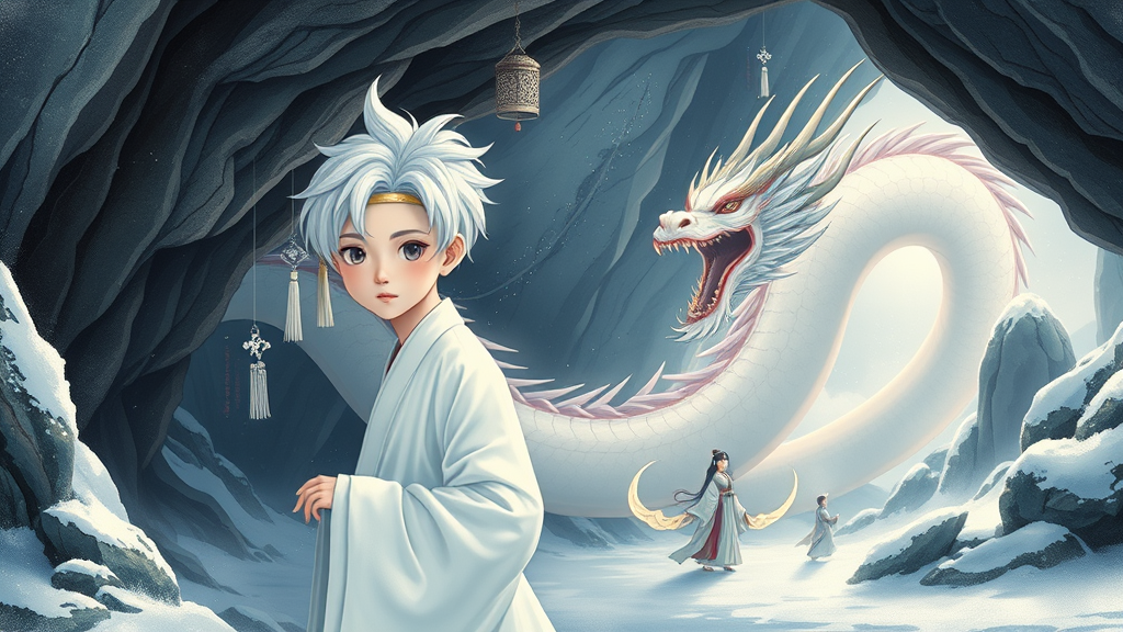 A mystical Chinese boy with snow-white hair resides in an enchanting cave, embodying a celestial aura. Adorned in an elegant white Daofu and a simple headband, he is accompanied by a majestic Chinese dragon. The scene unfolds in the style of traditional Japanese Ukiyo-e art, portraying a breathtaking Chinese fairy tale landscape. The air is laden with a gentle mist, and a pristine layer of snow blankets the earth. Graceful figures move serenely through the picturesque scenery, embodying an ethereal and timeless beauty.