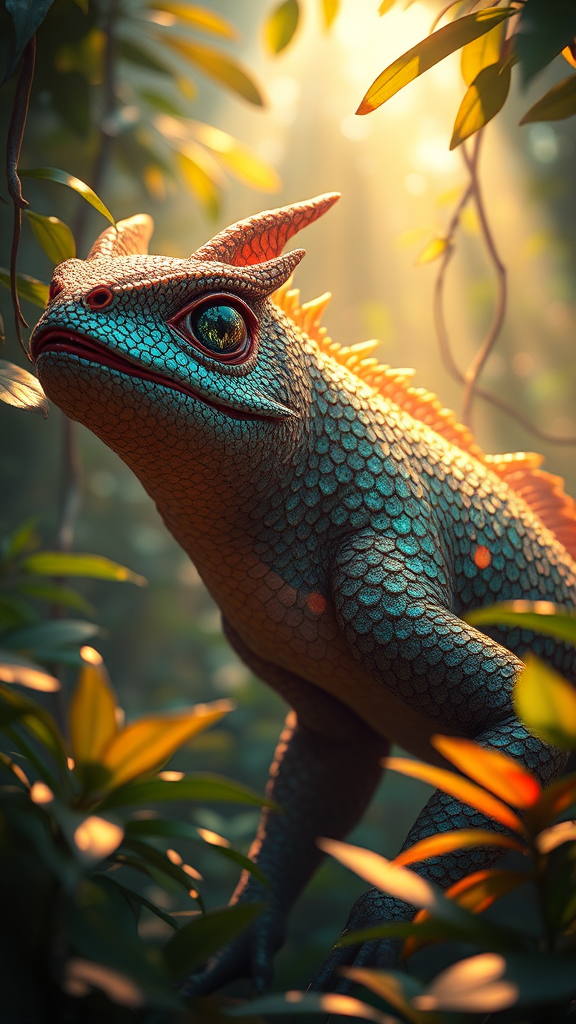 A mystical creature in the heart of a vibrant jungle, its features captured in exquisite detail, its scales shimmering with iridescence under ethereal, magical lighting. Surrounding leaves and vines gleam in bright, vivid colors, while soft volumetric rays of sunlight filter through the dense canopy. The creature's eyes glisten like jewels, and its form is highlighted in stunning photorealism, evoking a sense of wonder in this enchanted forest world.