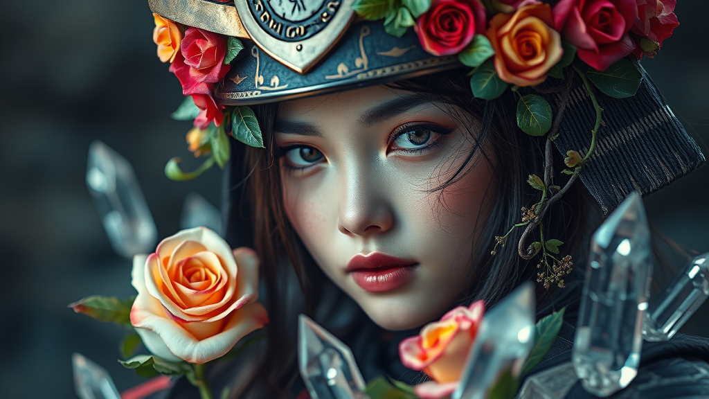A mystical creature with a Japanese samurai girl, her helmet adorned with vibrant, colorful roses intertwined with delicate vines, surrounded by shimmering crystals. Captured in a close angle, the scene is illuminated with photography-style lighting, revealing ultra-realistic and intricate details. The harmonious blend of natural beauty and warrior spirit showcases her serene yet formidable presence. The aspect ratio is 4:5, with emphasis on unparalleled detail and clarity.