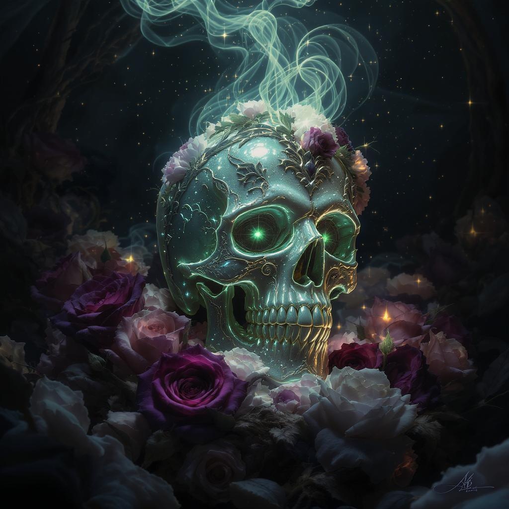 A mystical crystal skull encircled by lush, blooming roses, set in a universe of dark fantasy where ethereal magic dances through the air. Bathed in cinematic lighting that casts dramatic shadows and highlights, this scene is crafted in the intricately detailed and ornate style reminiscent of Brian Froud. The composition serves as an epic wallpaper, rendered with ultra-high definition, high dynamic range, and an impressive 8k resolution. The crystal skull, shimmering with inner luminescence, is both mysterious and captivating, while the roses add a touch of natural elegance and timeless beauty. This magical tableau is enhanced with a fantastical atmosphere, inviting the viewer into a world of myth and wonder.