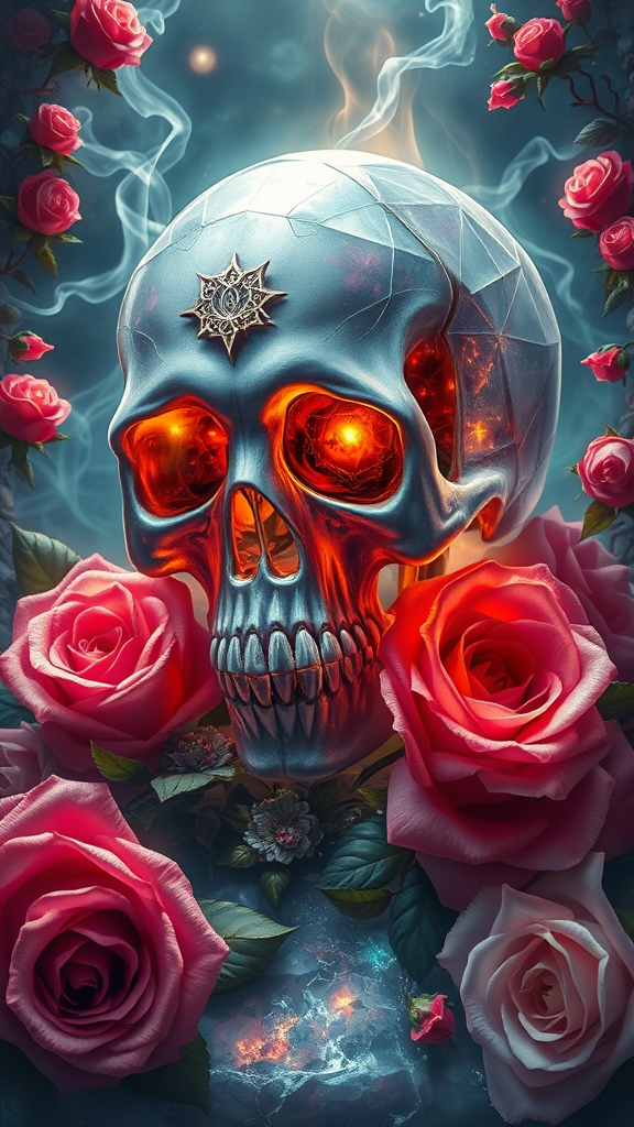 A mystical crystal skull entwined with vibrant roses, set in a realm of dark fantasy; the scene exudes ethereal magic with an epic, cinematic glow. The composition is adorned with intricate details and lavish ornamentation, inspired by the style of Brian Froud. The image bursts with fantastical elements captured in UHD, HDR, 8k, enveloping the viewer in a realm where enchantment meets high-definition artistry.