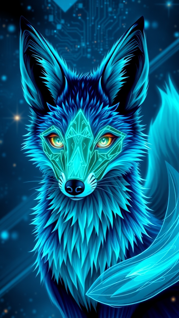 A mystical digital fox with shimmering fur in hues of electric blue and neon green, its eyes glinting with intelligence and mischief, wears an ornate mask made of geometric patterns over its snout. The background is an abstract blend of circuitry and starlit sky, giving the impression of a creature from a futuristic world, blending nature with technology seamlessly. The fox's ears are perked, and its bushy tail swirls around in a faint glow, adding an element of ethereal grace.