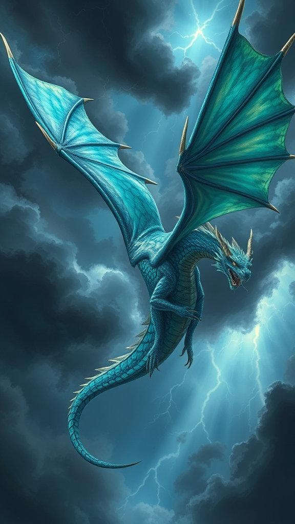 A mystical dragon soaring through a stormy sky, painted by Antonio J. Manzanedo, in ultra-high detail, featuring iridescent scales shimmering with shades of emerald and sapphire, elongated wings slicing through dark clouds, surrounded by flashes of lightning and distant rumblings of thunder, conveying a sense of majesty and power, captured in a tall 1:2 aspect ratio.