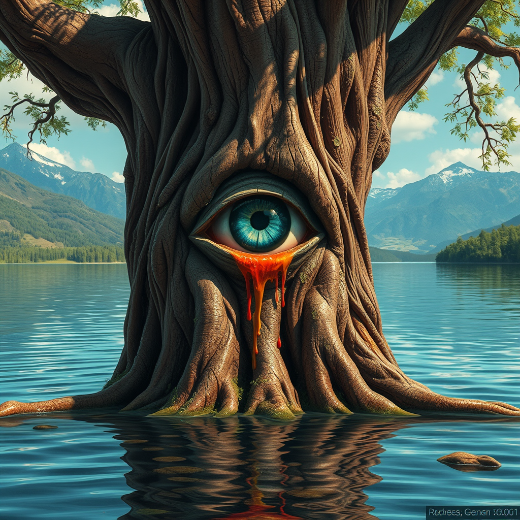 A mystical eye embedded in the gnarled bark of an ancient tree stands watchful near the serene edge of a rippling lake, its surface reflecting the expansive landscape surrounding it. The tree's roots intertwine with hints of urban surrealism, blending nature with an otherworldly cityscape. Paint drips from the eye, merging vivid hues with the earth, while echoes of Brian Despain's style breathe life into each detail. The scene unfolds like a dreamscape, drawing influence from Mars Ravelo's storytelling flair and Mati Klarwein's intricate imagination, where every shadow and light plays upon a surreal junction of worlds.