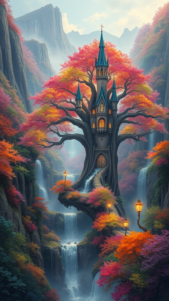 A mystical fae forest city nestled in a valley encircled by towering cliffs and cascading waterfalls, where vibrant, multicolored trees create a kaleidoscope canopy. At its heart stands a colossal ancient tree intertwined with an elegant castle, its spires reaching toward the sky, as ethereal lights dance amongst the branches, casting a dreamlike aura across an oil canvas landscape.