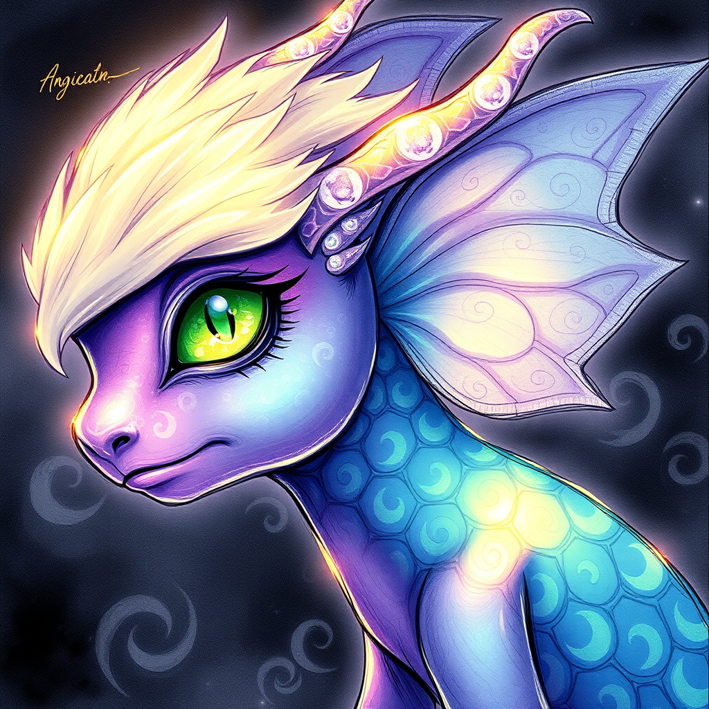 A mystical fae with shimmering emerald eyes and iridescent amethyst scales adorned with intricate crescent moon patterns, set against a backdrop of enigmatic swirling waves. This enchanting creature, inspired by the artistic style of Darwyn Cooke, radiates a magical aura. The detailed sketch captures its whimsical nature, with a vibrant yet mysterious ambiance, inviting viewers into a world of wonder and fantasy.