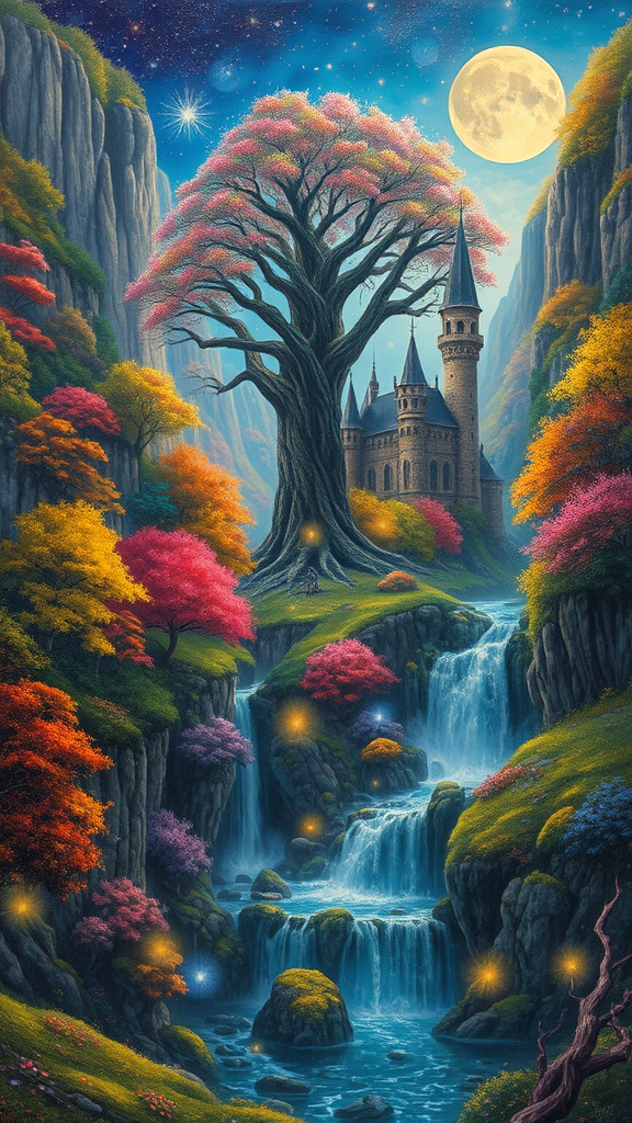 A mystical fae woodland city nestled among towering cliffs and cascading waterfalls, where vibrant multicolored trees paint the landscape. At its heart stands a colossal ancient tree, surrounded by an enchanting castle whose spires reach towards the sky. The scene is illuminated by the shimmering light of ethereal fireflies and the gentle glow of moonlit blossoms, creating an otherworldly ambiance. This otherworldly paradise captures the timeless magic of nature's wonders as seen through the vivid strokes of an oil canvas painting.