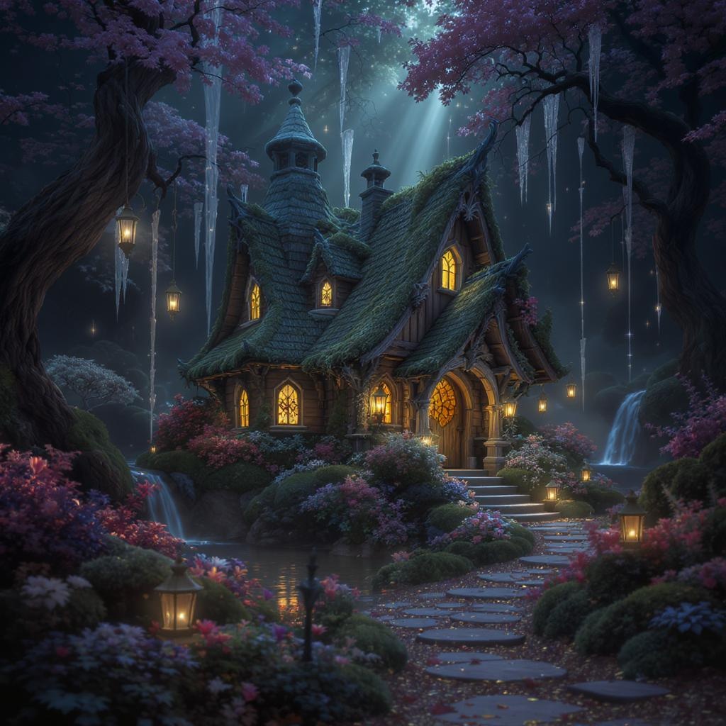 A mystical fairy tale wonderland unfolds, where nature flourishes with an enchanting ambiance; nestled at its heart is a captivating magical house. This small, intricately detailed wooden cottage stands resilient, surrounded by a dark yet mesmerizing landscape. The house glows warmly from within, its light gently spilling out into the night, casting an inviting aura. Delicate lanterns hang gracefully, illuminating the path leading to the entrance, their gentle flickers dancing along symmetrically mirrored surfaces. The environment is depicted with extraordinary detail, capturing the whimsical beauty of the setting, and the photorealism highlights the minute textures of moss-covered stones and delicate, blooming flowers. Light rays pierce through the dense canopy above, casting ethereal patterns that enhance the magical scenery. Ambient occlusion and cinematic composition bring a raw, breathtaking realism, transforming the view into an amazingly beautiful masterpiece, replete with bloom and shimmering light effects that draw the eyes to this solitary haven of magic amidst the shadowed forest.