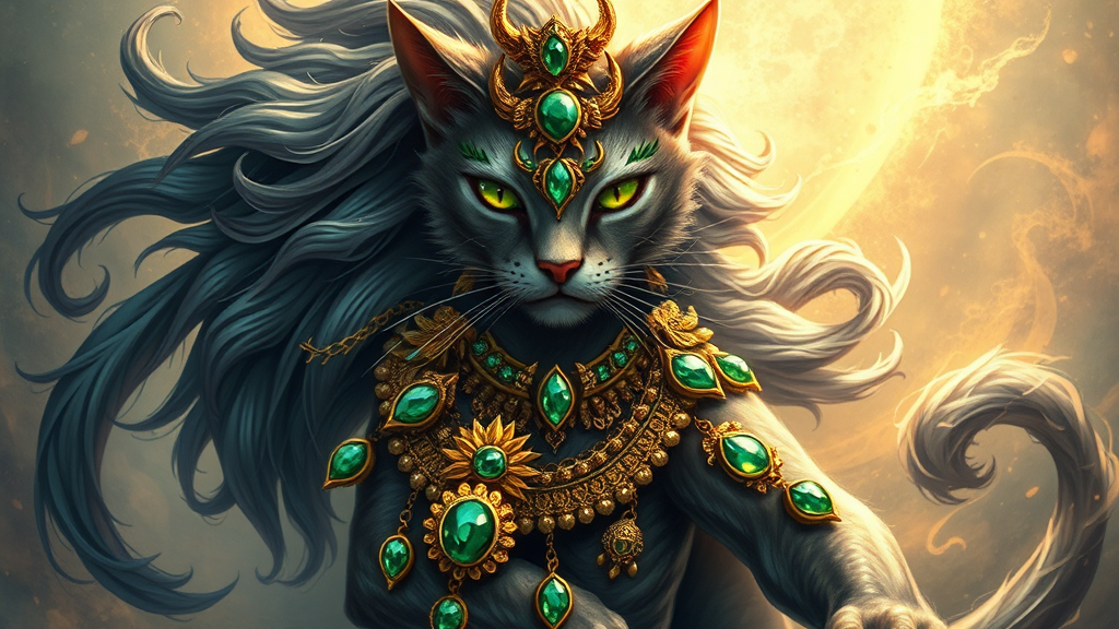 A mystical, feline deity with the elegance of a cat and the protective strength of a lioness, adorned in shimmering gold and emerald jewelry, embodying the ancient spirit of guardianship and grace, surrounded by an aura of wisdom and mystery.