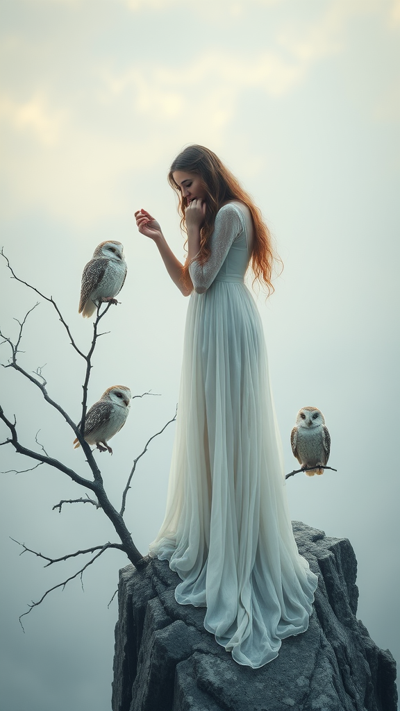 A mystical feminine figure with owls, set against an icy white and azure-hued backdrop, echoes the elegance of Northern Renaissance art. She stands on the edge of a precipice, her slender fingers tracing the contours of a wispy branch, with tender owlets clustered around her. The overall aesthetic evokes a sense of wistful etherealness, as if she has stepped out of a dream. The palette oscillates between soft whites, creamy ambers, and wisps of pale cerulean, imbuing the scene with an otherworldly quality, while the owls' gentle eyes seem to hold ancient wisdom. The result is a semi-tranquil, softly-glowing, and enchanted tableau, which also subtly nods to the mysticism of the Wiccan tradition.