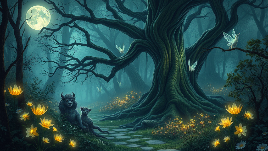 A mystical forest bathed in moonlight, where luminescent flowers line the winding paths and ethereal creatures with shimmering wings dance around ancient, whispering trees.