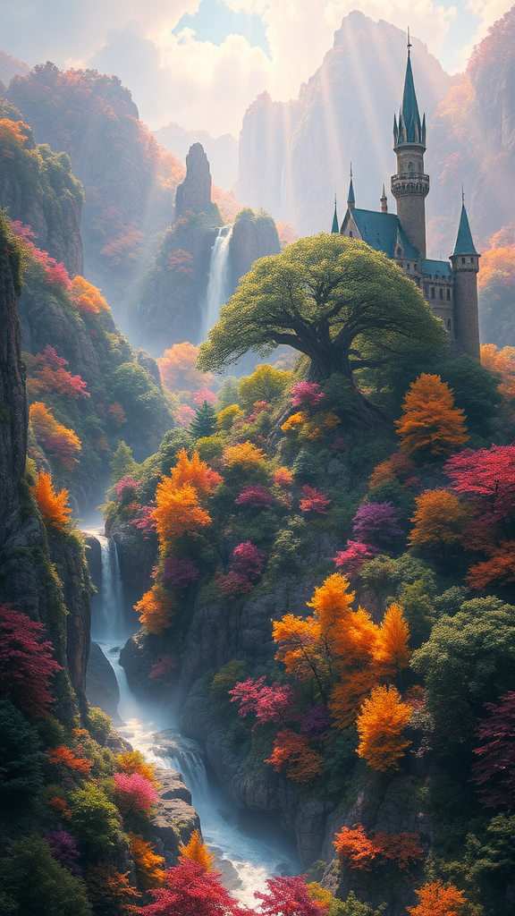 A mystical forest city inhabited by enchanting fae beings, nestled amidst towering cliffs and cascading waterfalls. The landscape is vibrant with trees in a spectrum of colors, creating a kaleidoscope of hues. At the heart of this magical realm stands a colossal ancient tree, a symbol of life and wonder. Nearby, a magnificent castle rises, its spires reaching for the sky, blending seamlessly with the enchanting surroundings. The scene is alive with an ethereal glow, as rays of sunlight dance through the multicolored foliage, casting enchanting patterns upon the ground below.