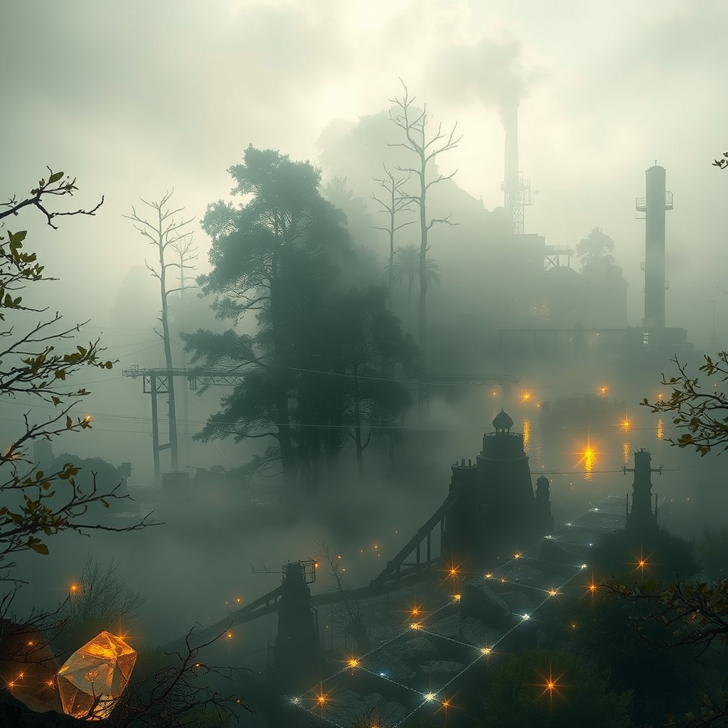 A mystical forest enveloped in thick fog, where a witch’s presence feels both eerie and enchanting. High contrast visuals catch the eye—a photograph where ethereal lights dance through the trees. The scene warps into a deformed sketch that blends water elements with an industrial landscape. Gold accents shimmer like scattered jewels among faceted crystals, creating a sense of mystic allure. A blend of cyberpunk and steampunk aesthetics adds a layer of complexity, reminiscent of an imaginative Alice in Wonderland. Ominous clouds rumble with thunder, juxtaposed against structures combining modern and old architecture, crafted from ivory and marble. This paradise feels otherworldly, captured in 4k detail with colors that pop in HDR. The atmosphere is organic yet streaked with rust, rendering an octane-rendered masterpiece that captures the imagination.