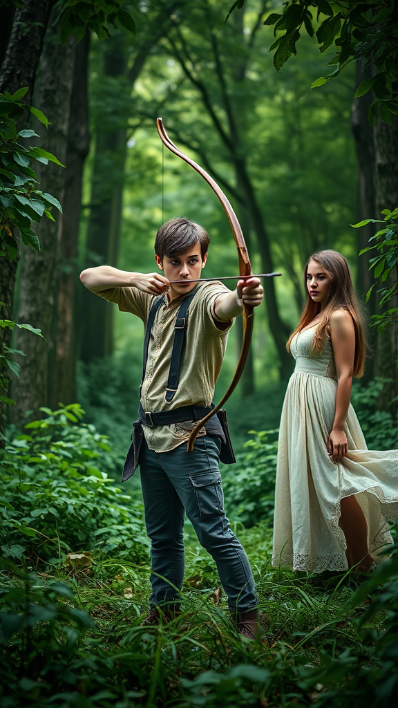 A mystical forest scene where a young male hunter stands poised in the center of the frame, drawing his bow with skillful precision. The lush greenery surrounds him, creating a vibrant backdrop. On his side, a girl in a flowing dress complements the scene, her gaze fixed on the hunter, adding a sense of connection and intrigue to the composition. Symmetry defines the arrangement, harmonizing the hunter's determined stance with the girl's serene presence amidst the whispering leaves.