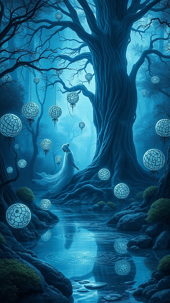 A mystical forest scene with a towering tree and an ethereal wraith at the center, in a visionary and otherworldly style. The landscape is adorned with intricate spherical sculptures that float around, casting shimmering reflections in light blue and indigo hues. The atmosphere is filled with mesmerizing optical illusions and energy, inspired by the dynamic illustrations of Dan Mumford. Shadows and colors dance in harmony, creating a vivid, immersive experience. Subtle hints of luminescent mist swirl through the air, adding depth and mystery to the enchanting scene.