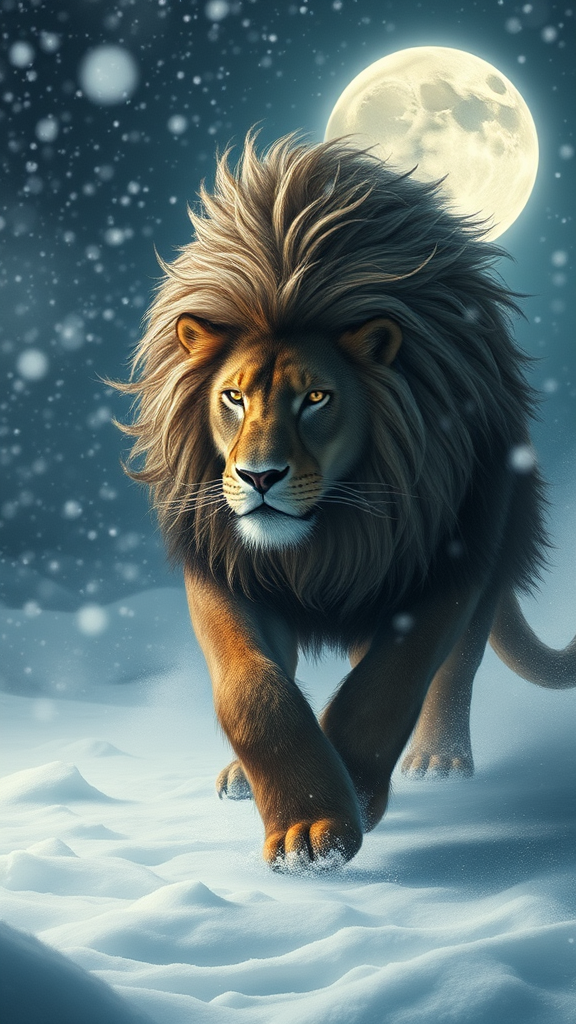 A mystical fusion of a man and a lion prowls through the heart of a fierce blizzard, enveloped by the biting chill of a winter's night. This majestic creature is draped in thick, flowing furs that ripple like waves under the moonlight, its eyes aglow with an ethereal luminescence. The fantasy setting is rich with a sense of ancient magic, as snowflakes dance in the air, casting a soft, silvery sheen across the landscape. Inspired by the enchanting artwork of Greg Rutkowski, the scene unfolds with a blend of realism and imagination, capturing the creature's strength and grace as it strides with purpose through the storm-laden night.