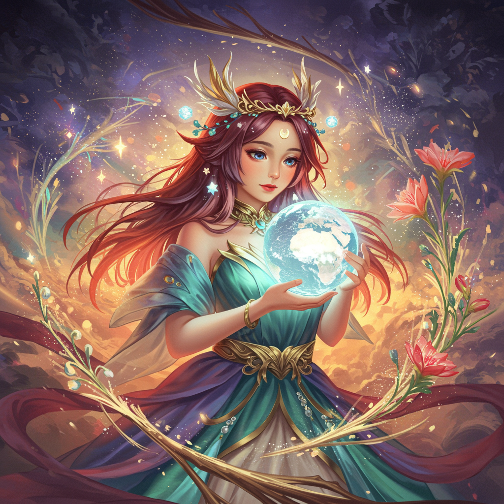 A mystical girl adorned in an enchanting gown cradles a shimmering globe, embodying earth goddess mythology. This breathtaking fantasy art piece captures realistic fantasy elements, with echoes of Artgerm and Atey Ghailan’s intricate style. Inspired by Guweiz, the artwork presents her amidst a swirling aura of vibrant colors and ethereal light. Her gentle expression reflects wisdom and serenity, as luminescent flora and celestial motifs surround her, creating a harmonious blend of nature and magic. This exquisite digital painting exudes beauty and captivates with its enchanting, anime-inspired fantasy charm.