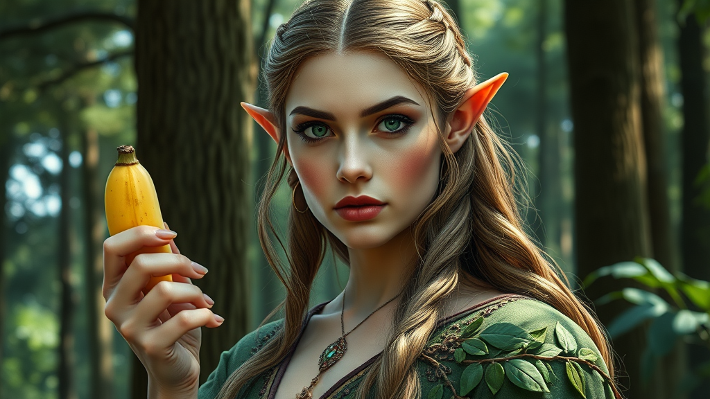 A mystical half-elf woman gracefully holds a banana in her hand, exuding the aura of a sorceress in a serene forest setting. Her features are akin to an elfic priestess, blending perfectly with the natural surroundings. She embodies the essence of a forest mage and druid, her eyes reflecting ancient wisdom and her attire adorned with intricate patterns of leaves and vines. The portrait captures her in an epic fantasy art style, reminiscent of the enchanting works of Magali Villeneuve and Leona Wood. Her symmetrical face radiates a gentle power, set against a backdrop of towering trees and dappled sunlight, evoking the rich narrative of a fantasy RPG world.