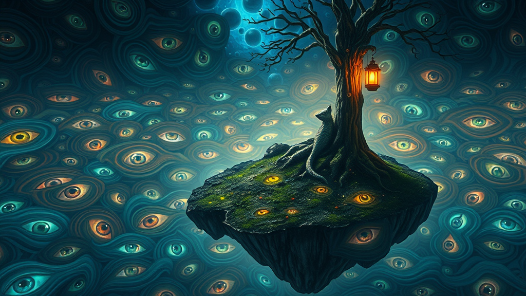 A mystical island floats in an ocean of swirling multicolored eyes, each glinting with an enigmatic light. Perched at the top of a tall, ancient tree, a wise creature with shimmering scales holds a lantern, casting a gentle, soft glow that illuminates its surroundings. The scene is rendered with ultra-realistic detail and a touch of ethereal darkness, capturing every intricate feature of the enigmatic landscape. The composition is devoid of any imperfections or distractions, focusing purely on the captivating beauty of this surreal realm.
