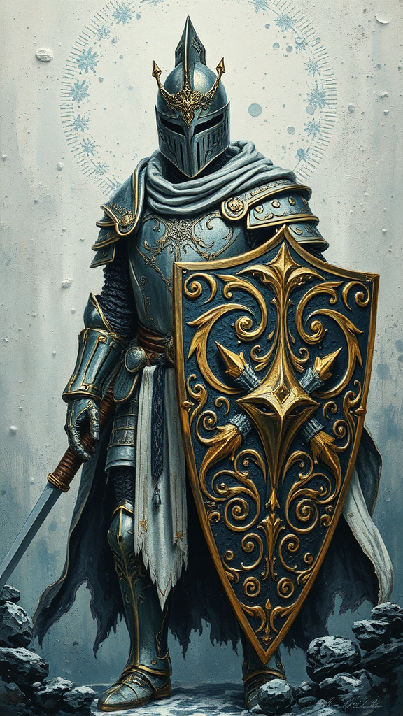 A mystical knight clad in intricately designed armor, holding a shield embossed with swirling patterns and a flowing cloak, depicted in the adventurous pulp style. The artwork is predominantly dark white and bronze, with mottled textures resembling Yup'ik art. The scene is crafted using heavy palette knife techniques, with touches of light indigo and green adding a modern flare from the 1970s to the present. The knight stands in a noble pose, exuding an aura of strength and mystery within a tall, narrow frame ratio of 1:2, enhanced with subtle creative elements that infuse a sense of ethereal wonder.