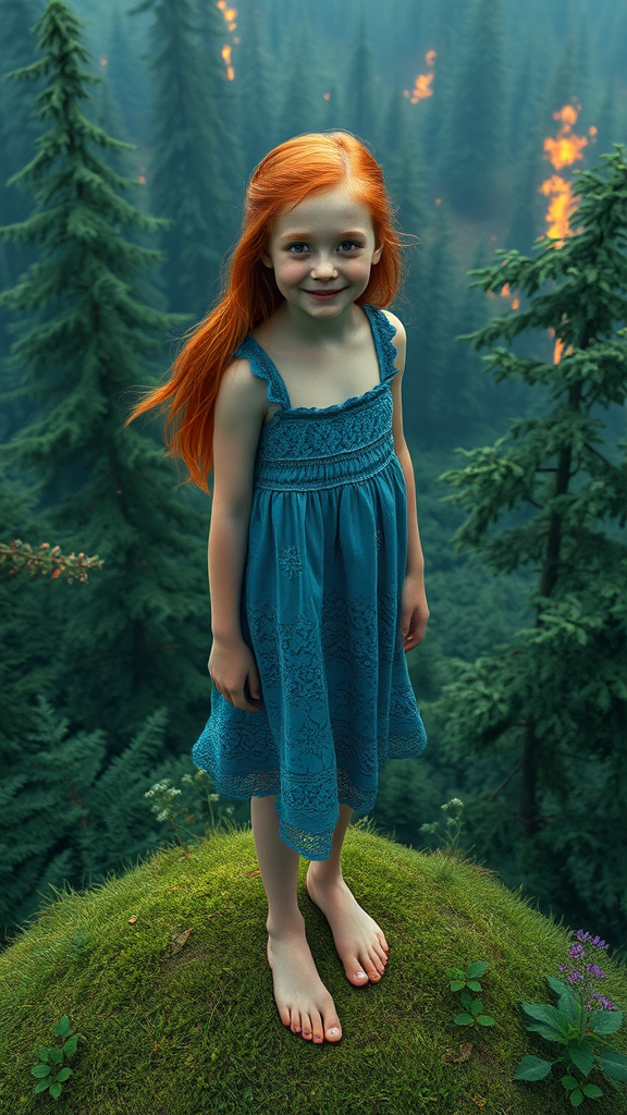 A mystical landscape blends elements of a fantasy forest with the fiery ambiance of Dante's inferno. At the heart of this scene, an enchanting young Nordic girl with striking red hair stands atop a verdant hill. Her delicate, bare feet grace the ground as she beams a gentle smile. She wears a flowing blue lace dress, adding an ethereal touch to her presence. Her face is a masterpiece of perfect symmetry and detail, highlighted by her mesmerizing hazel eyes with distinctive, circular irises. The scene captures a cinematic and hyperrealistic portrayal, rendered in stunning 3D with vibrant colors, drawing inspiration from the works of Mucha, Klimt, and Erte. The lush forest around her teems with life, contrasting with hints of infernal elements. This piece, designed for high definition displays, combines surreal and eerie undertones, evoking the stylistic influences of H.R. Giger and Beksinski, creating an intricate, darkly epic artwork. The scene is brought to life with the state-of-the-art rendering capabilities of Unreal Engine 5, ensuring an ultra-sharp, vibrant portrayal worthy of a digital art contest winner.