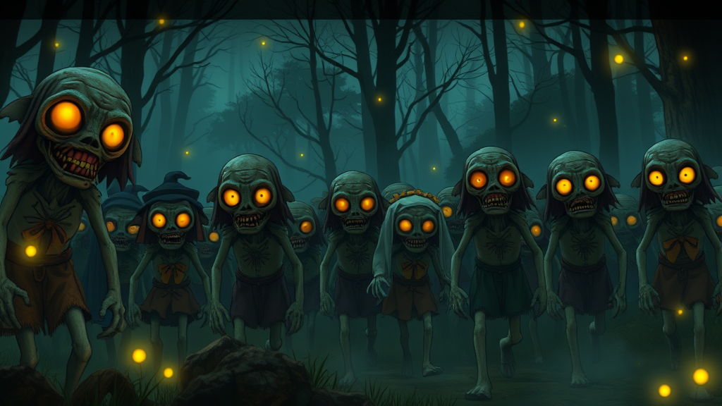 A mystical landscape unfolds in a Studio Ghibli-inspired animation, with a scene featuring an eerie, mist-laden forest enveloped in twilight. Emerging from the shadows, a horde of whimsical yet unsettling zombie-like creatures, their grotesque features designed by Hayao Miyazaki, stagger forward. The creatures' eyes glint with a haunting luminescence, contrasting against their decayed, colorful garments fluttering in the wind. The atmosphere blends a nostalgic retro anime style with a touch of horror, as ethereal fireflies meander through the fog, casting an otherworldly glow over the surreal tableau.