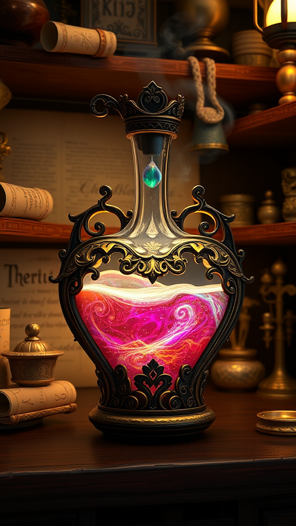 A mystical potion brewed in an ornate heart-shaped flask, nestled within the shelves of an ancient apothecary. This fantasy-inspired videogame asset is crafted with intricate detail, resonating with the magic and wonder often seen in Studio Ghibli's work. Rendered in 8k with Cinema4D and Octane Render, the scene boasts extreme detail and high sample quality, capturing a cinematic essence. The flask emanates a soft, enchanting glow, its contents swirling with iridescent colors, surrounded by shelves lined with faded scrolls and mysterious herbs. This detailed artwork invites viewers into a world of fantasy and magic, a perfect blend of whimsy and realism.