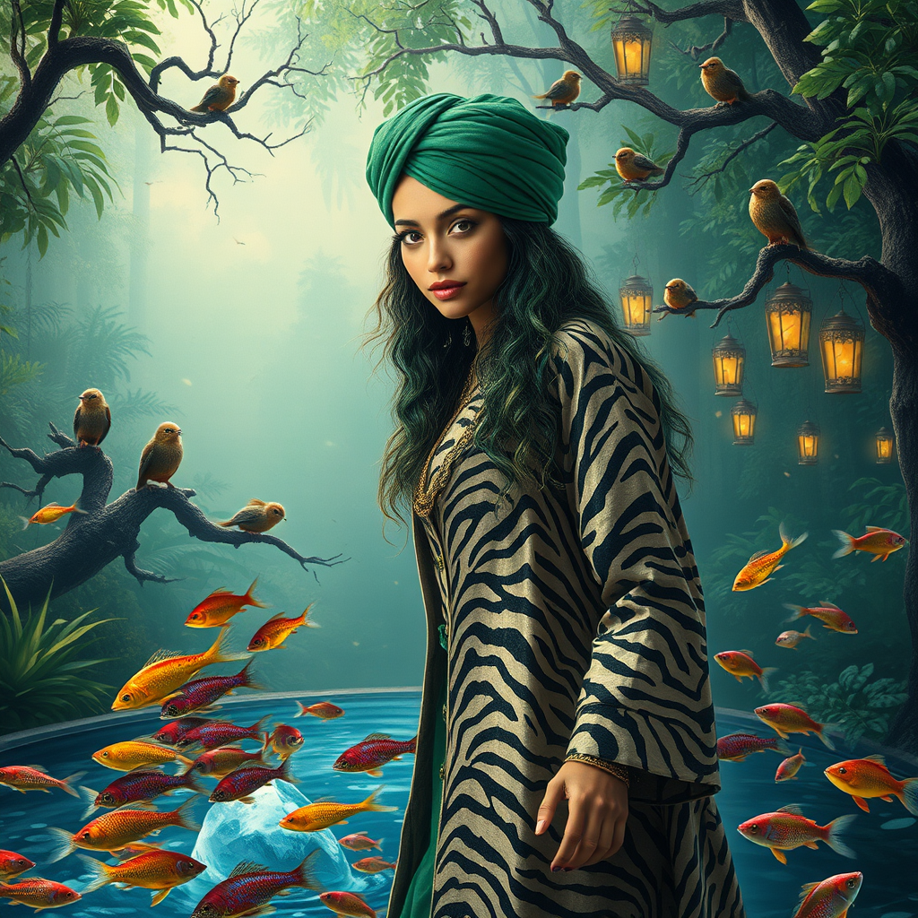 A mystical safari queen descends upon a tapestry jungle, her zebra-print coat and emerald turban blending effortlessly with the surroundings. Iridescent scales glimmering amidst her locks like stardust, as she stands confidently at the edge of a water crystal pool surrounded by schools of rainbow-colored fish. A chorus of chattering, tree-dwelling creatures, perched atop lantern-lit branches, peer down at her with a mix of curiosity and admiration.