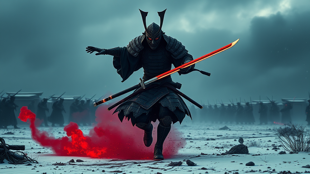 A mystical samurai, masked and enigmatic, charges forward amidst a grim battlefield, wielding a mystical katana that shimmers with ethereal energies. His stardust-cast full-body armor glimmers under the overcast sky, leaving a trail of crimson red smoke in his wake. Set against a sprawling, epic landscape reminiscent of the Sengoku period, the scene is painted in morbid, dark hues with key visuals evoking a sense of dread and awe. Echoes of the Renaissance are hinted through sophisticated detailing, as volumetric light pierces the wintry atmosphere. Pools of crimson red punctuate the snow-laden ground beneath the samurai's feet. The battlefield, rendered with incredible realism and detail, comes alive in an ultra-wide epic shot reminiscent of the dark works of Greg Rutkowski and Marc Simonetti. The digital art, powered by Unreal Engine 5, offers an award-winning, hyper-realistic depiction, capturing the samurai's dance of death in this cold, eerie landscape.