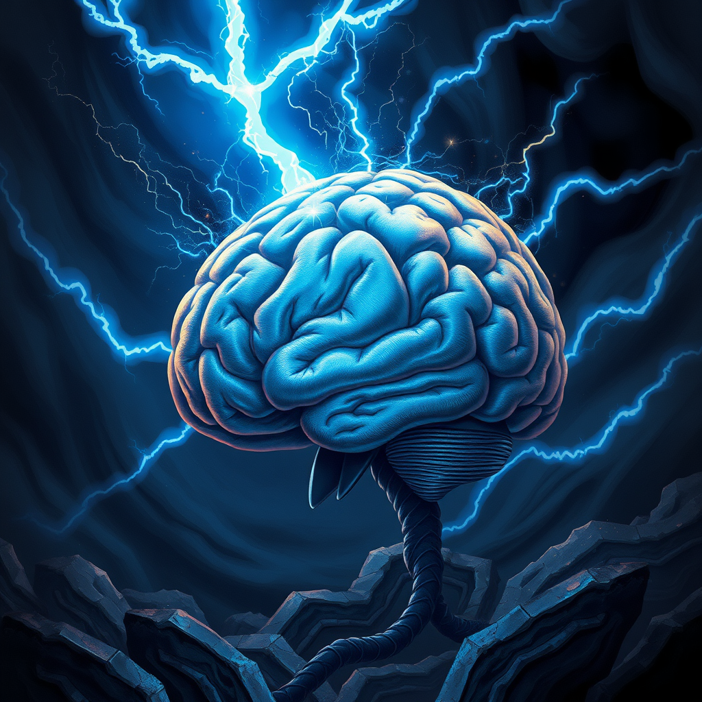 A mystical scene depicts a brain struck by a dazzling neon blue lightning bolt, transforming into a radiant orb of energy. This orb, with a metallic sheen, is enveloped by swirling streams of vibrant energy. The dark and mysterious environment is bathed in faint shadows, adding depth and intrigue to the atmosphere. The entire illustration captures a sense of otherworldly enchantment, featuring intricate details and textures that emphasize its fantastical nature.